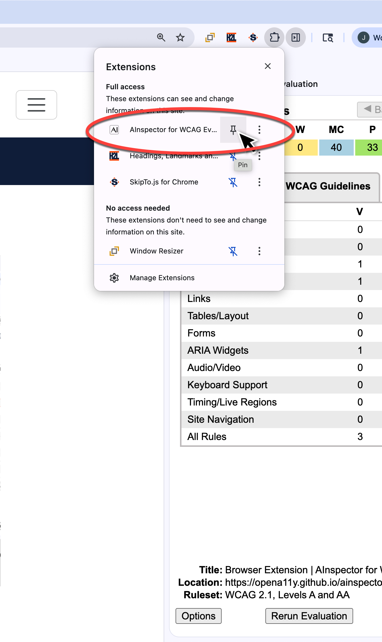 - Select the extensions manager icon in the Chrome toolbar and locate AInspector for WCAG Evaluation in the list of extensions.