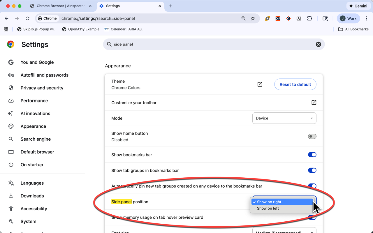 - Go to the "Side panel position" option and you can choose between: "Show on right" or "Show on left" options.