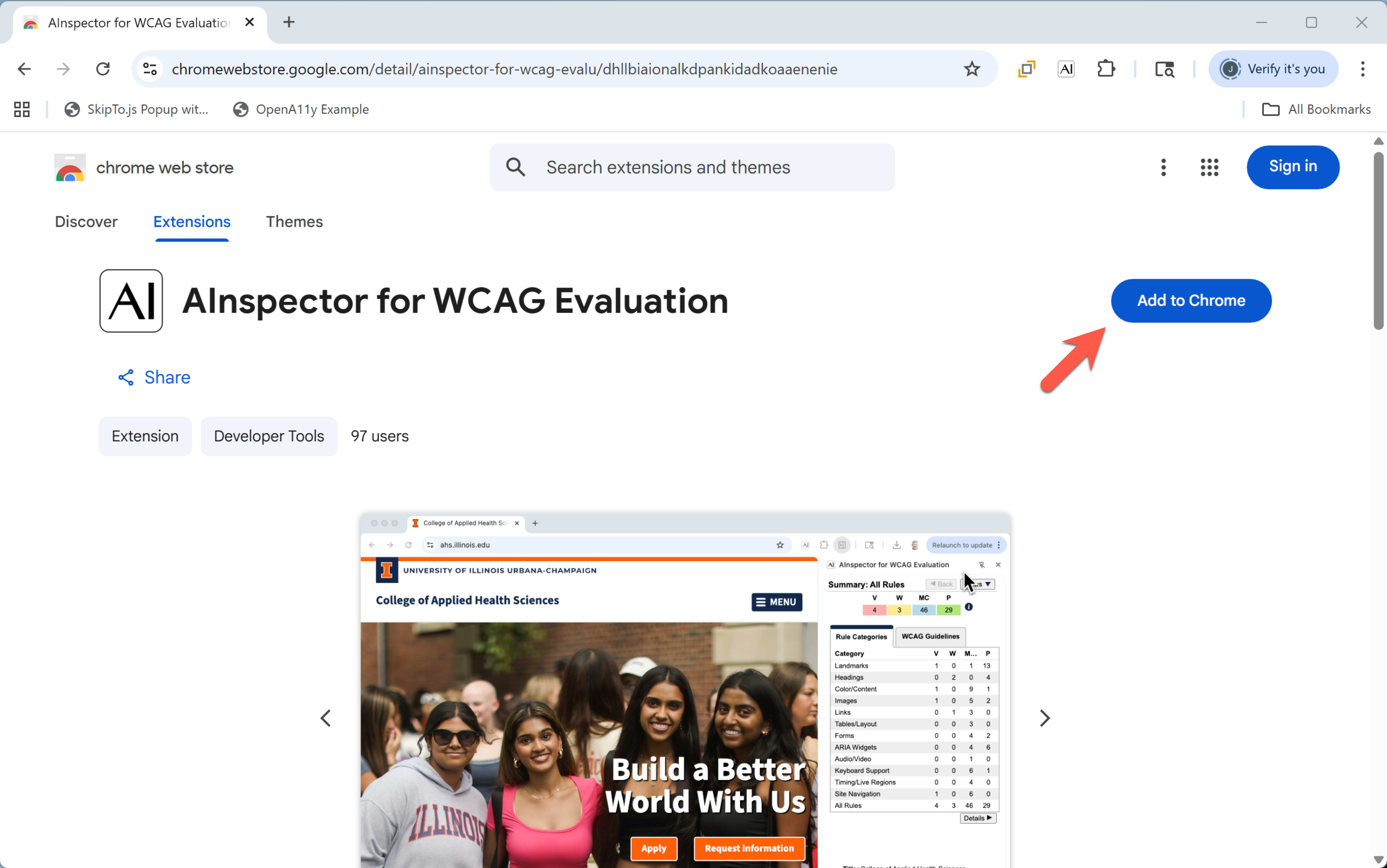 After you install AInspector for WCAG Evaluation you can pin the icon to the toolbar to open and close the side panel.
