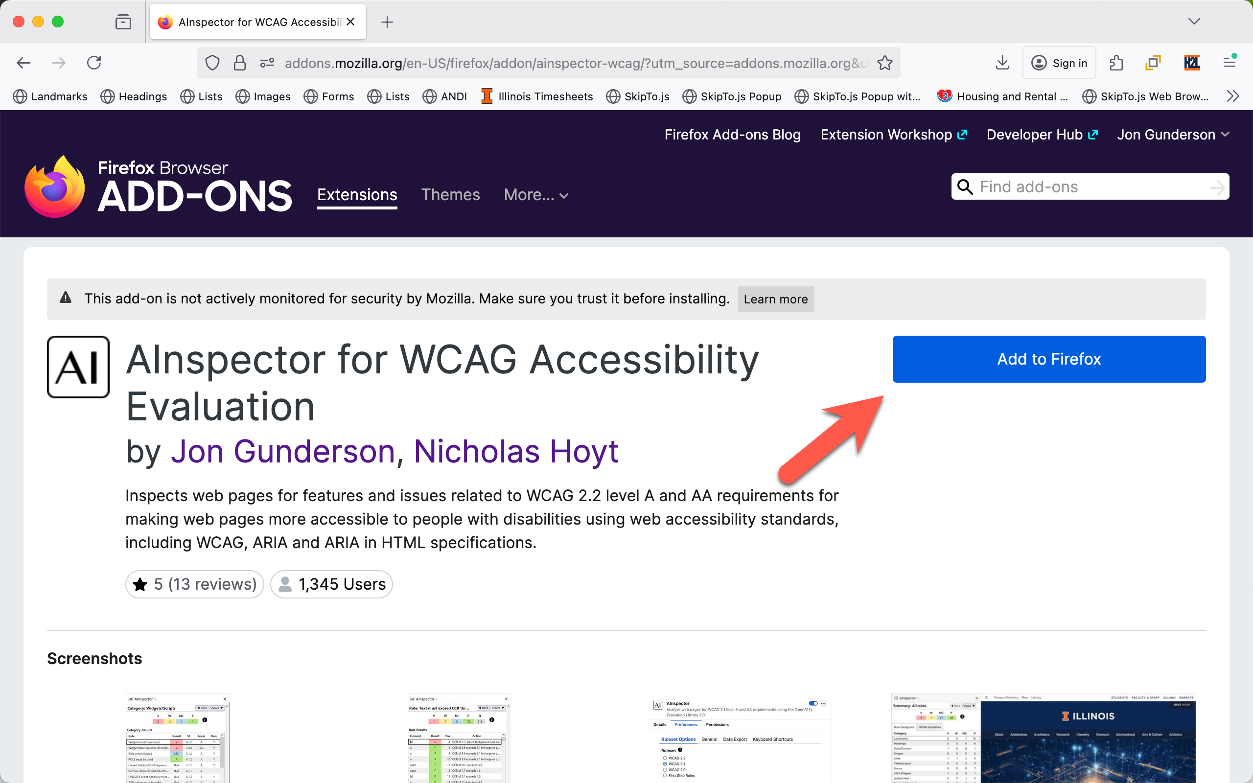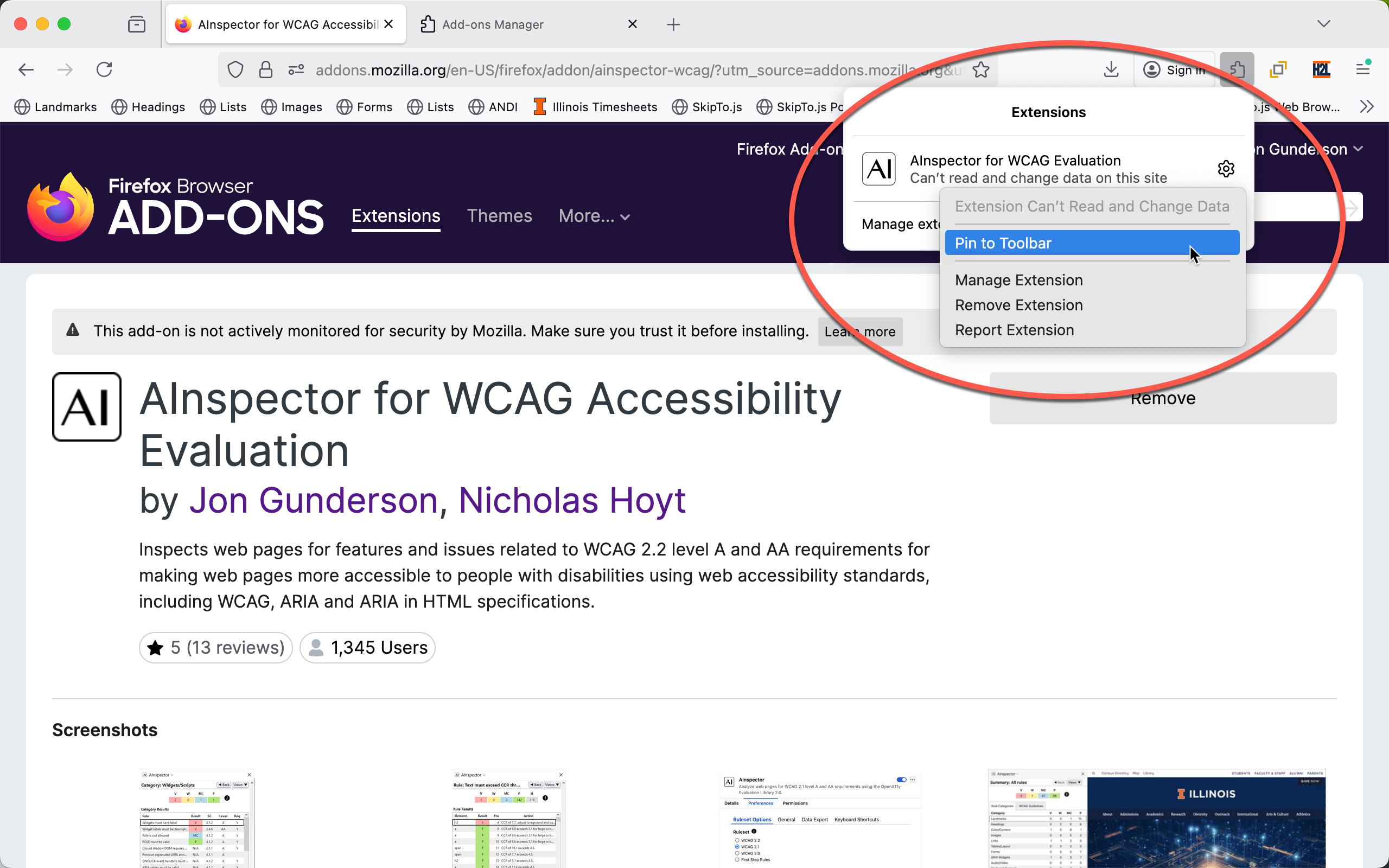 - Select the extensions manager icon in the Firefox toolbar and locate AInspector for WCAG Evaluation in the list of extensions.