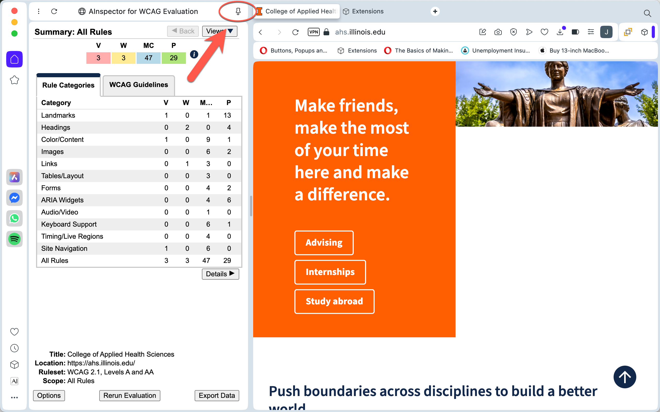 The AInspector for WCAG Evaluation side panel when open can behave two ways: as an overlay on top of the content window or as a separate window to the left of the content window. There is a "pin" at the top of the side panel to toggle between the two options.