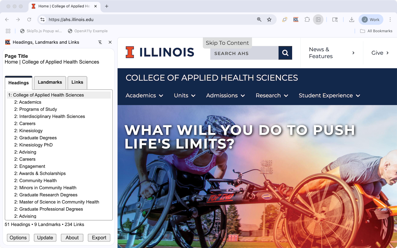 The Headings, Landmarks and Links Side Panel (H2L) extension provides a browser side panel to view the headings, landmark regions and links on a web page. It can be used to verify the proper use of headings and landmarks in identifying the layout and structure of a web page and testing links t see if the link text provides a good description of the target of the link. The extension uses the the OpenA11y Evaluation Library to collect information the page title, headers, landmarks and links for viewing in the side panel.
